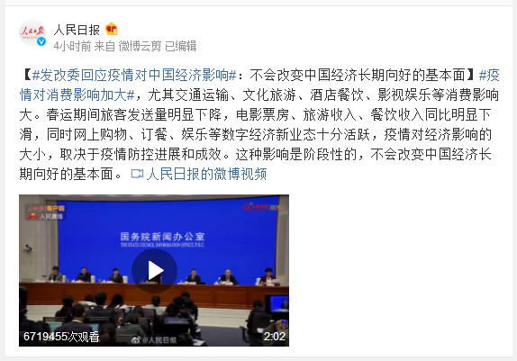 #疫情对消费影响加大#,尤其交通运输、文化旅游、酒店餐饮、影视娱乐等消费影响大。春运期间旅客发送量明显下降,电影票房、旅游收入、餐饮收入同比明显下滑,同时网上购物、订餐、娱乐等数字经济新业态十分活跃,疫情对经济影响的大小,取决于疫情防控进展和成效。这种影响是阶段性的,不会改变中国经济长期向好的基本面。