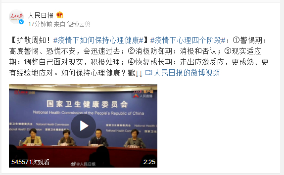 #疫情下心理四个阶段#:①警惕期:高度警惕、恐慌不安,会迅速过去;②消极防御期:消极和否认;③现实适应期:调整自己面对现实,积极处理;④恢复成长期:走出应激反应,更成熟、更有经验地应对。如何保持心理健康?