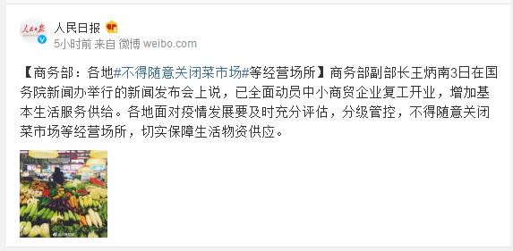 商务部副部长王炳南3日在国务院新闻办举行的新闻发布会上说,已全面动员中小商贸企业复工开业,增加基本生活服务供给。各地面对疫情发展要及时充分评估,分级管控,不得随意关闭菜市场等经营场所,切实保障生活物资供应。