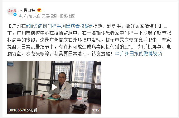 日前,广州市疾控中心在疫情监测中,在一名确诊患者家中门把手上发现了新型冠状病毒的核酸,这是广州首次在外环境中发现,提示市民应更注意手卫生。专家提醒,日常家居细节中,有许多可能造成病毒间接传播的途径:如手机屏幕、电脑键盘、水龙头等等,都需要日常清洁。