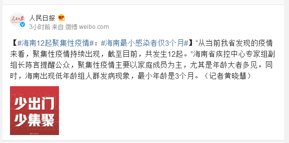 “从当前我省发现的疫情来看,聚集性疫情持续出现,截至目前,共发生12起。”海南省疾控中心专家组副组长陈言提醒公众,聚集性疫情主要以家庭成员为主,尤其是年龄大者多见。同时,海南出现低年龄组人群发病现象,最小年龄是3个月。(记者黄晓慧)