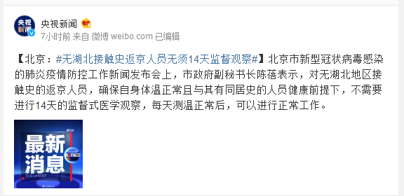 北京市新型冠状病毒感染的肺炎疫情防控工作新闻发布会上,市政府副秘书长陈蓓表示,对无湖北地区接触史的返京人员,确保自身体温正常且与其有同居史的人员健康前提下,不需要进行14天的监督式医学观察,每天测温正常后,可以进行正常工作。