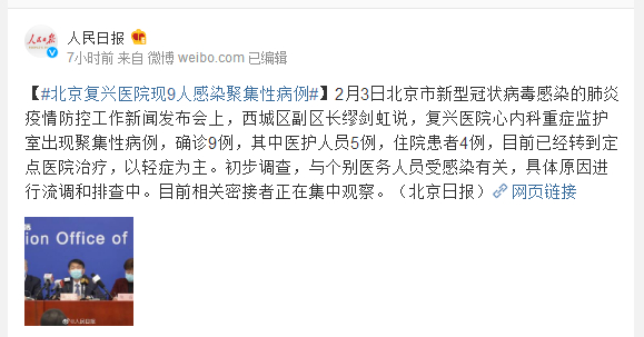 2月3日北京市新型冠状病毒感染的肺炎疫情防控工作新闻发布会上,西城区副区长缪剑虹说,复兴医院心内科重症监护室出现聚集性病例,确诊9例,其中医护人员5例,住院患者4例,目前已经转到定点医院治疗,以轻症为主。初步调查,与个别医务人员受感染有关,具体原因进行流调和排查中。目前相关密接者正在集中观察。(北京日报)