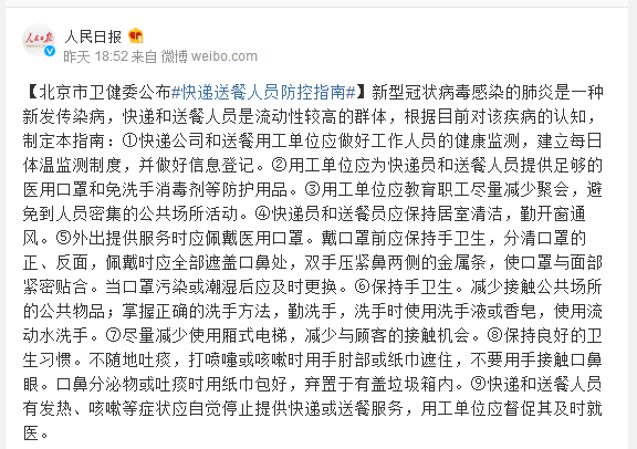 新型冠状病毒感染的肺炎是一种新发传染病,快递和送餐人员是流动性较高的群体,根据目前对该疾病的认知,制定本指南:①快递公司和送餐用工单位应做好工作人员的健康监测,建立每日体温监测制度,并做好信息登记。②用工单位应为快递员和送餐人员提供足够的医用口罩和免洗手消毒剂等防护用品。③用工单位应教育职工尽量减少聚会,避免到人员密集的公共场所活动。④快递员和送餐员应保持居室清洁,勤开窗通风。⑤外出提供服务时应佩戴医用口罩。戴口罩前应保持手卫生,分清口罩的正、反面,佩戴时应全部遮盖口鼻处,双手压紧鼻两侧的金属条,使口罩与面部紧密贴合。当口罩污染或潮湿后应及时更换。⑥保持手卫生。减少接触公共场所的公共物品;掌握正确的洗手方法,勤洗手,洗手时使用洗手液或香皂,使用流动水洗手。⑦尽量减少使用厢式电梯,减少与顾客的接触机会。⑧保持良好的卫生习惯。不随地吐痰,打喷嚏或咳嗽时用手肘部或纸巾遮住,不要用手接触口鼻眼。口鼻分泌物或吐痰时用纸巾包好,弃置于有盖垃圾箱内。⑨快递和送餐人员有发热、咳嗽等症状应自觉停止提供快递或送餐服务,用工单位应督促其及时就医。