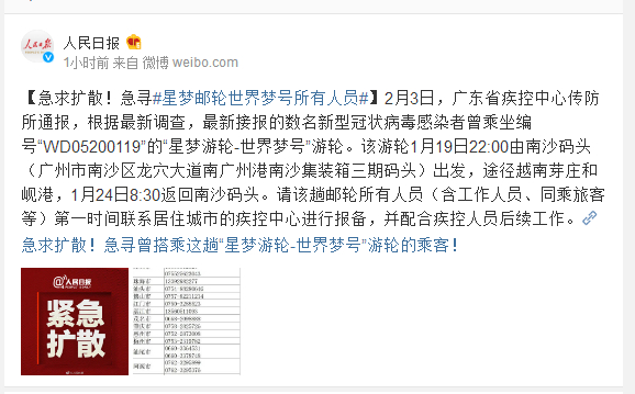 2月3日,广东省疾控中心传防所通报,根据最新调查,最新接报的数名新型冠状病毒感染者曾乘坐编号“WD05200119”的“星梦游轮-世界梦号”游轮。该游轮1月19日22:00由南沙码头(广州市南沙区龙穴大道南广州港南沙集装箱三期码头)出发,途径越南芽庄和岘港,1月24日8:30返回南沙码头。请该趟邮轮所有人员(含工作人员、同乘旅客等)第一时间联系居住城市的疾控中心进行报备,并配合疾控人员后续工作。