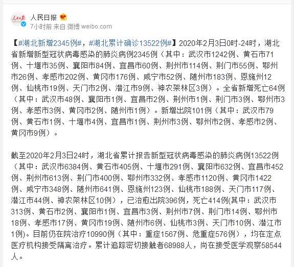 2020年2月3日0时-24时,湖北省新增新型冠状病毒感染的肺炎病例2345例(其中:武汉市1242例、黄石市71例、十堰市35例、襄阳市84例、宜昌市60例、荆州市114例、荆门市55例、鄂州市26例、孝感市202例、黄冈市176例、咸宁市52例、随州市183例、恩施州12例、仙桃市19例、天门市2例、潜江市9例、神农架林区3例)。全省新增死亡64例 (其中:武汉市48例、襄阳市1例、宜昌市2例、荆州市1例、荆门市3例、鄂州市3例、孝感市3例、黄冈市2例、随州市1例)。新增出院101例(其中:武汉市79例、黄石市1例、十堰市4例、宜昌市1例、荆州市3例、鄂州市2例、孝感市2例、黄冈市9例)。