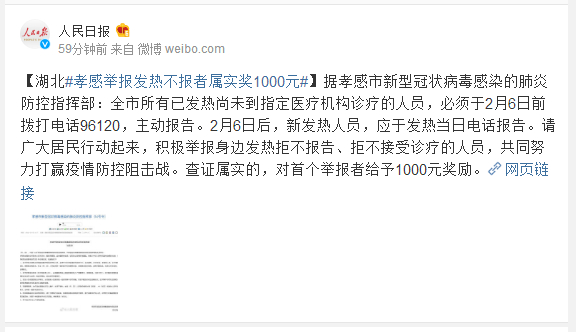 据孝感市新型冠状病毒感染的肺炎防控指挥部:全市所有已发热尚未到指定医疗机构诊疗的人员,必须于2月6日前拨打电话96120,主动报告。2月6日后,新发热人员,应于发热当日电话报告。请广大居民行动起来,积极举报身边发热拒不报告、拒不接受诊疗的人员,共同努力打赢疫情防控阻击战。查证属实的,对首个举报者给予1000元奖励。