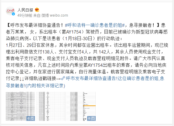 1月27日、29日在家休息,其余时间都在运营出租车。该出租车运营期间,现已梳理出利用微信支付138人、支付宝支付4人,共 142人,其余人员使用现金支付,乘客电子支付记录、现金支付人员轨迹及载客里程明细见附件。请广大市民认真核对相关信息,凡在上述时间段内乘坐蒙AY1754出租车的乘客,请务必向当地疾控中心登记,并在家进行居家隔离,自行测量体温。载客里程明细及乘客电子支付记录↓↓→呼市发布最详细协查通告!这位确诊患者是的姐,急寻接触者!(内附相关详细记录)
