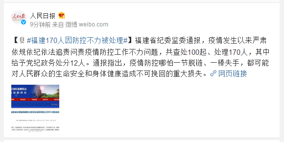 福建省纪委监委通报,疫情发生以来严肃依规依纪依法追责问责疫情防控工作不力问题,共查处100起、处理170人,其中给予党纪政务处分12人。通报指出,疫情防控哪怕一节脱链、一棒失手,都可能对人民群众的生命安全和身体健康造成不可挽回的重大损失。