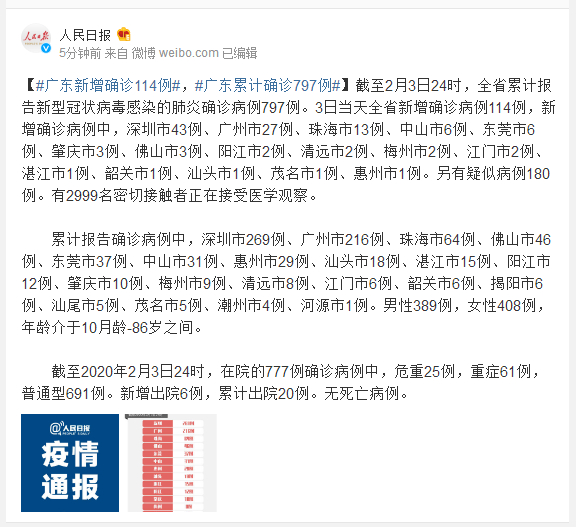 截至2月3日24时,全省累计报告新型冠状病毒感染的肺炎确诊病例797例。3日当天全省新增确诊病例114例,新增确诊病例中,深圳市43例、广州市27例、珠海市13例、中山市6例、东莞市6例、肇庆市3例、佛山市3例、阳江市2例、清远市2例、梅州市2例、江门市2例、湛江市1例、韶关市1例、汕头市1例、茂名市1例、惠州市1例。另有疑似病例180例。有2999名密切接触者正在接受医学观察。