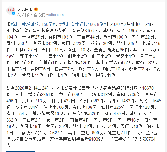 2020年2月4日0时-24时,湖北省新增新型冠状病毒感染的肺炎病例3156例,其中:武汉市1967例、黄石市104例、十堰市27例、襄阳市103例、宜昌市44例、荆州市100例、荆门市22例、鄂州市50例、孝感市342例、黄冈市223例、咸宁市36例、随州市65例、恩施州15例、仙桃市37例、天门市11例、潜江市10例。全省新增死亡65例,其中:武汉市49例、襄阳市1例、宜昌市1例、荆州市2例、荆门市2例、孝感市1例、黄冈市6例、随州市2例、仙桃市1例。新增出院125例,其中:武汉市65例、黄石市8例、十堰市3例、襄阳市6例、宜昌市7例、荆州市3例、荆门市10例、鄂州市2例、孝感市2例、黄冈市11例、咸宁市1例、随州市6例、恩施州1例。