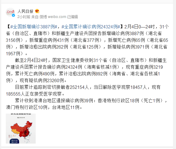 截至2月4日24时,国家卫生健康委收到31个省(自治区、直辖市)和新疆生产建设兵团累计报告确诊病例24324例(海南省核减1例),现有重症病例3219例,累计死亡病例490例,累计治愈出院病例892例(海南省、湖北省各核减1例),现有疑似病例23260例。