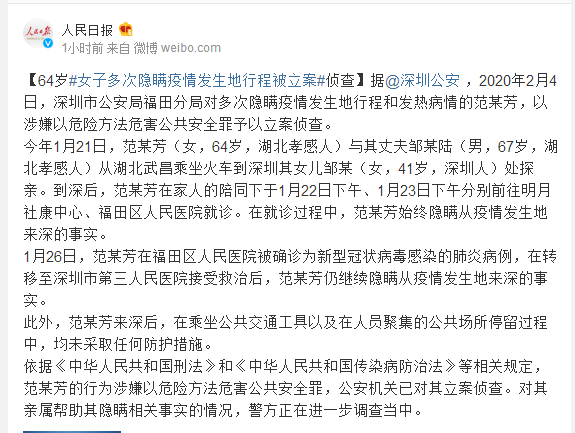 据@深圳公安 ,2020年2月4日,深圳市公安局福田分局对多次隐瞒疫情发生地行程和发热病情的范某芳,以涉嫌以危险方法危害公共安全罪予以立案侦查。