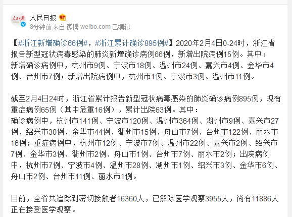 2020年2月4日0-24时,浙江省报告新型冠状病毒感染的肺炎新增确诊病例66例,新增出院病例15例。其中: