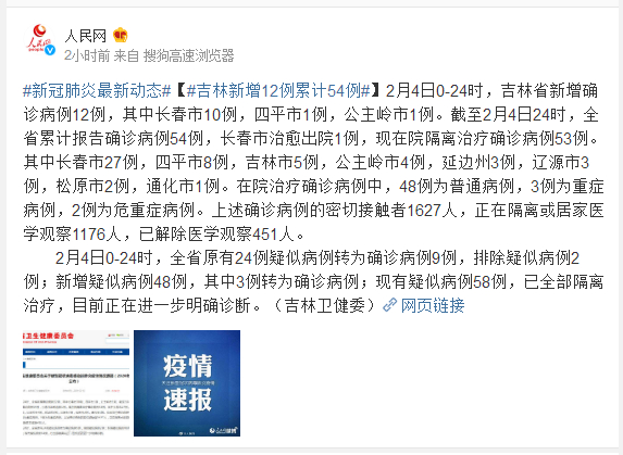 2月4日0-24时,吉林省新增确诊病例12例,其中长春市10例,四平市1例,公主岭市1例。截至2月4日24时,全省累计报告确诊病例54例,长春市治愈出院1例,现在院隔离治疗确诊病例53例。其中长春市27例,四平市8例,吉林市5例,公主岭市4例,延边州3例,辽源市3例,松原市2例,通化市1例。在院治疗确诊病例中,48例为普通病例,3例为重症病例,2例为危重症病例。上述确诊病例的密切接触者1627人,正在隔离或居家医学观察1176人,已解除医学观察451人。