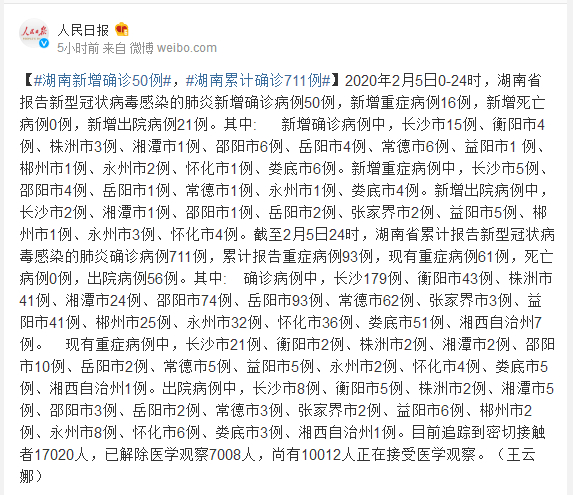 2020年2月5日0-24时,湖南省报告新型冠状病毒感染的肺炎新增确诊病例50例,新增重症病例16例,新增死亡病例0例,新增出院病例21例。其中: 新增确诊病例中,长沙市15例、衡阳市4例、株洲市3例、湘潭市1例、邵阳市6例、岳阳市4例、常德市6例、益阳市1 例、郴州市1例、永州市2例、怀化市1例、娄底市6例。新增重症病例中,长沙市5例、邵阳市4例、岳阳市1例、常德市1例、永州市1例、娄底市4例。新增出院病例中,长沙市2例、湘潭市1例、邵阳市1例、岳阳市2例、张家界市2例、益阳市5例、郴州市1例、永州市3例、怀化市4例。截至2月5日24时,湖南省累计报告新型冠状病毒感染的肺炎确诊病例711例,累计报告重症病例93例,现有重症病例61例,死亡病例0例,出院病例56例。其中: 确诊病例中,长沙179例、衡阳市43例、株洲市41例、湘潭市24例、邵阳市74例、岳阳市93例、常德市62例、张家界市3例、益阳市41例、郴州市25例、永州市32例、怀化市36例、娄底市51例、湘西自治州7例。 现有重症病例中,长沙市21例、衡阳市2例、株洲市2例、湘潭市2例、邵阳市10例、岳阳市2例、常德市5例、益阳市5例、永州市2例、怀化市4例、娄底市5例、湘西自治州1例。出院病例中,长沙市8例、衡阳市5例、株洲市2例、湘潭市5例、邵阳市3例、岳阳市2例、常德市3例、张家界市2例、益阳市6例、郴州市2例、永州市8例、怀化市6例、娄底市3例、湘西自治州1例。目前追踪到密切接触者17020人,已解除医学观察7008人,尚有10012人正在接受医学观察。(王云娜)
