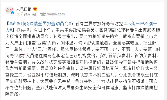 据央视,今日上午,中共中央政治局委员、国务院副总理孙春兰出席武汉肺炎疫情全面排查动员会。孙春兰指出,要全力抓好源头防控,武汉市要举全市之力入户上门排查“四类”人员,测体温、询问密切接触者,全面落实辖区、行业部门、单位、个人“四方”责任,强化网格化管理,要不落一户、不漏一人,要第一时间将“四类”人员送往隔离点和定点医疗机构救治,实行首诊负责制、首访负责制。孙春兰强调,要以战时状态落实落细各项防控措施,各级领导干部要把疫情防控作为当前最重要、最紧迫的任务来抓,坚决履行好属地责任,坚决杜绝形式主义官僚主义,设立24小时值班制度,战时状态决不能当逃兵,否则就会被永远钉在历史的耻辱柱上,大家要心无旁骛、争分夺秒,全力以赴解决措施不精确、落实不到位的问题,全力以赴保障人民群众生命安全和身体健康,坚决打赢疫情防控阻击战。