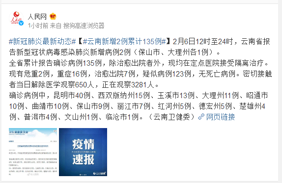 2月6日12时至24时,云南省报告新型冠状病毒感染肺炎新增病例2例(保山市、大理州各1例)。