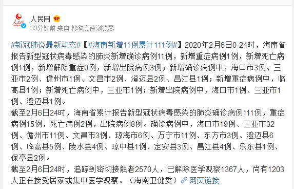 截至2月6日24时,追踪到密切接触者2570人,已解除医学观察1367人,尚有1203人正在接受居家或集中医学观察。(海南卫健委)