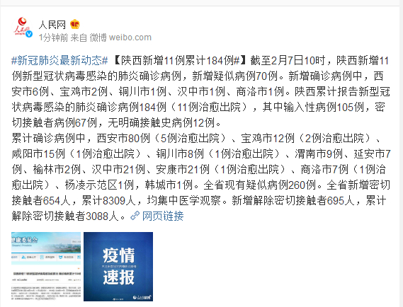 截至2月7日10时,陕西新增11例新型冠状病毒感染的肺炎确诊病例,新增疑似病例70例。新增确诊病例中,西安市6例、宝鸡市2例、铜川市1例、汉中市1例、商洛市1例。陕西累计报告新型冠状病毒感染的肺炎确诊病例184例(11例治愈出院),其中输入性病例105例,密切接触者病例67例,无明确接触史病例12例。