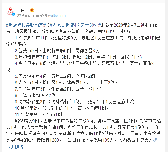 截至2020年2月7日9时, 内蒙古自治区累计报告新型冠状病毒感染的肺炎确诊病例50例,其中: