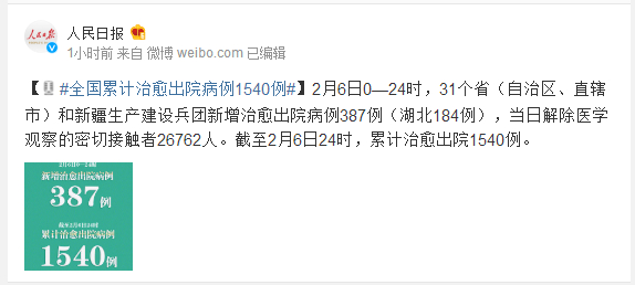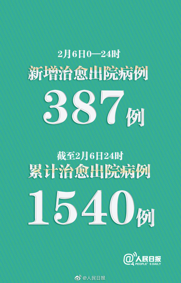 2月6日0—24时,31个省(自治区、直辖市)和新疆生产建设兵团新增治愈出院病例387例(湖北184例),当日解除医学观察的密切接触者26762人。截至2月6日24时,累计治愈出院1540例。