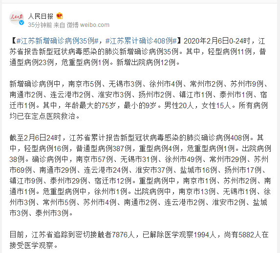 2020年2月6日0-24时,江苏省报告新型冠状病毒感染的肺炎新增确诊病例35例。其中,轻型病例11例,普通型病例23例,危重型病例1例。新增出院病例12例。
