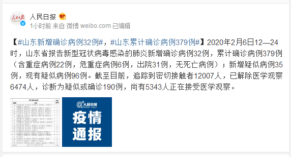 2020年2月6日12—24时,山东省报告新型冠状病毒感染的肺炎新增确诊病例32例,累计确诊病例379例(含重症病例22例,危重症病例6例,出院31例,无死亡病例);新增疑似病例35例,现有疑似病例96例。截至目前,追踪到密切接触者12007人,已解除医学观察6474人,诊断为疑似或确诊190例,尚有5343人正在接受医学观察。