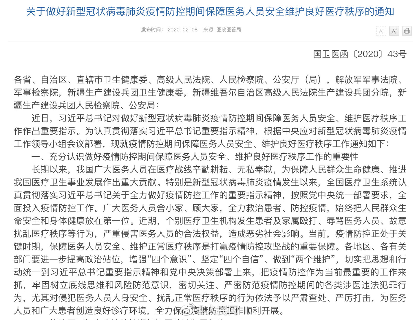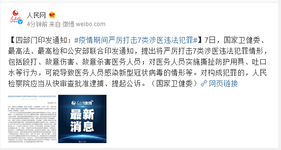 7日,国家卫健委、最高法、最高检和公安部联合印发通知,提出将严厉打击7类涉医违法犯罪情形,包括殴打、故意伤害、故意杀害医务人员;对医务人员实施撕扯防护用具、吐口水等行为,可能导致医务人员感染新型冠状病毒的情形等。对构成犯罪的,人民检察院应当从快审查批准逮捕、提起公诉。(国家卫健委)