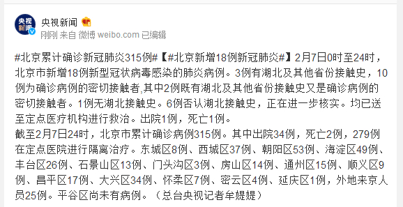 截至2月7日24时,北京市累计确诊病例315例。其中出院34例,死亡2例,279例在定点医院进行隔离治疗。东城区8例、西城区37例、朝阳区53例、海淀区49例、丰台区26例、石景山区13例、门头沟区3例、房山区14例、通州区15例、顺义区9例、昌平区17例、大兴区34例、怀柔区7例、密云区4例、延庆区1例,外地来京人员25例。平谷区尚未有病例。(总台央视记者牟媞媞)