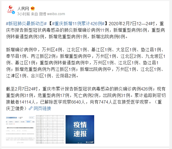 截至2月7日24时,重庆市累计报告新型冠状病毒感染的肺炎确诊病例426例;现有重型病例31例,危重型病例17例,死亡病例2例,出院病例31例。累计追踪到密切接触者14114人,已解除医学观察6640人,尚有7474人正在接受医学观察。(重庆卫健委)