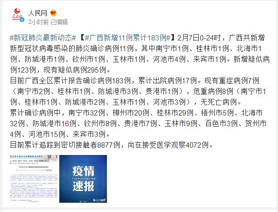2月7日0-24时,广西共新增新型冠状病毒感染的肺炎确诊病例11例,其中南宁市1例、桂林市1例、北海市1例、防城港市1例、钦州市1例、玉林市1例、河池市4例、来宾市1例。新增疑似病例123例,现有疑似病例295例。