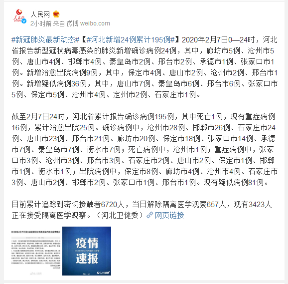 截至2月7日24时,河北省累计报告确诊病例195例,其中死亡1例,现有重症病例16例,累计治愈出院25例。确诊病例中,沧州市28例、邯郸市26例、石家庄市24例、唐山市23例、邢台市21例、廊坊市20例、保定市18例、张家口市14例、承德市7例、秦皇岛市7例、衡水市7例;死亡病例中,沧州市1例;重症病例中,张家口市3例、沧州市3例、邢台市3例、石家庄市2例、唐山市2例、保定市1例、邯郸市1例、衡水市1例;出院病例中,保定市8例、廊坊市4例、沧州市4例、石家庄市3例、唐山市2例、邯郸市2例、张家口市1例、邢台市1例。现有疑似病例81例。