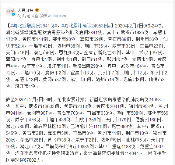 截至2020年2月7日24时,湖北省累计报告新型冠状病毒感染的肺炎病例24953例,其中:武汉市13603例、孝感市2313例、黄冈市2041例、随州市953例、荆州市941例、襄阳市907例、黄石市703例、宜昌市633例、荆门市588例、鄂州市569例、咸宁市476例、十堰市438例、仙桃市359例、天门市179例、恩施州160例、潜江市80例、神农架林区10例。已治愈出院1115例。死亡699例,其中:武汉市545例、黄石市2例、襄阳市5例、宜昌市8例、荆州市11例、荆门市18例、鄂州市20例、孝感市26例、黄冈市36例、咸宁市2例、随州市9例、仙桃市5例、天门市10例、潜江市2例。目前仍在院治疗19835例,其中:重症4188例、危重症1007例,均在定点医疗机构接受隔离治疗。累计追踪密切接触者114044人,尚在接受医学观察67802人。