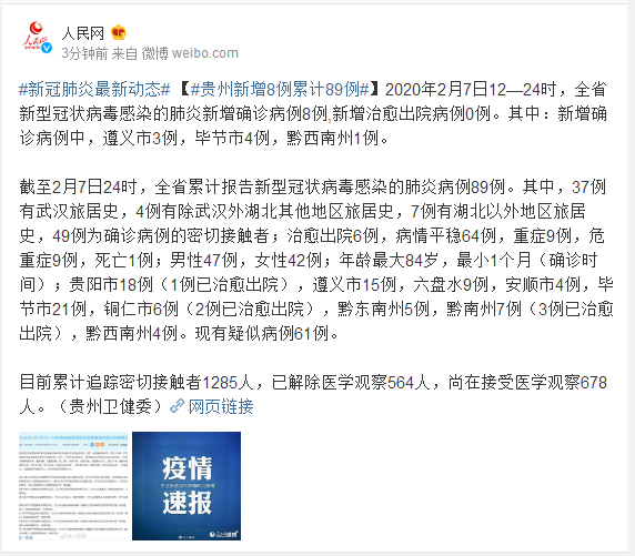 截至2月7日24时,全省累计报告新型冠状病毒感染的肺炎病例89例。其中,37例有武汉旅居史,4例有除武汉外湖北其他地区旅居史,7例有湖北以外地区旅居史,49例为确诊病例的密切接触者;治愈出院6例,病情平稳64例,重症9例,危重症9例,死亡1例;男性47例,女性42例;年龄最大84岁,最小1个月(确诊时间);贵阳市18例(1例已治愈出院),遵义市15例,六盘水9例,安顺市4例,毕节市21例,铜仁市6例(2例已治愈出院),黔东南州5例,黔南州7例(3例已治愈出院),黔西南州4例。现有疑似病例61例。