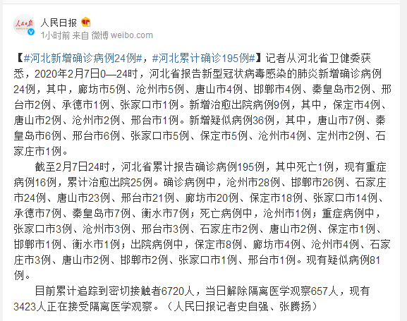 截至2月7日24时,河北省累计报告确诊病例195例,其中死亡1例,现有重症病例16例,累计治愈出院25例。确诊病例中,沧州市28例、邯郸市26例、石家庄市24例、唐山市23例、邢台市21例、廊坊市20例、保定市18例、张家口市14例、承德市7例、秦皇岛市7例、衡水市7例;死亡病例中,沧州市1例;重症病例中,张家口市3例、沧州市3例、邢台市3例、石家庄市2例、唐山市2例、保定市1例、邯郸市1例、衡水市1例;出院病例中,保定市8例、廊坊市4例、沧州市4例、石家庄市3例、唐山市2例、邯郸市2例、张家口市1例、邢台市1例。现有疑似病例81例。