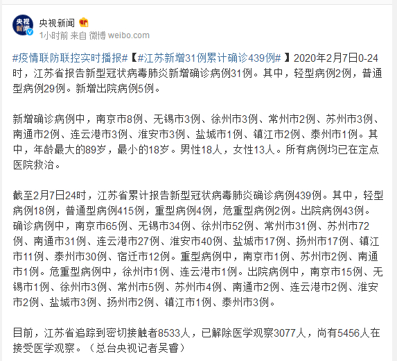 2020年2月7日0-24时,江苏省报告新型冠状病毒肺炎新增确诊病例31例。其中,轻型病例2例,普通型病例29例。新增出院病例5例。