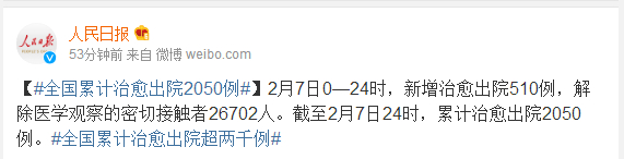 2月7日0—24时,新增治愈出院510例,解除医学观察的密切接触者26702人。截至2月7日24时,累计治愈出院2050例。
