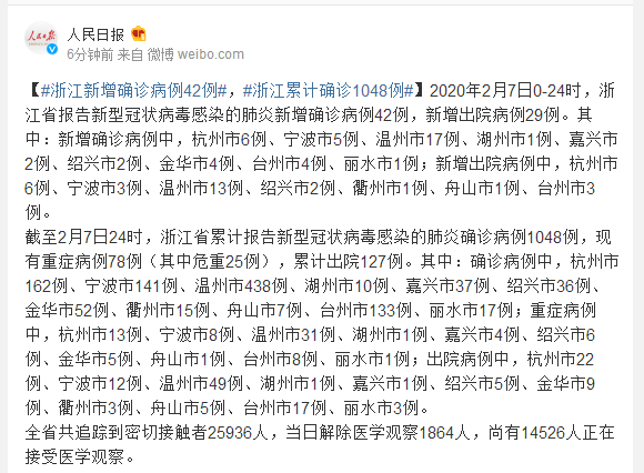 2月7日0-24时浙江新冠肺炎新增确诊病例42例 浙江累计确诊1048例
