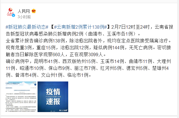 2月7日12时至24时,云南省报告新型冠状病毒感染肺炎新增病例2例(曲靖市、玉溪市各1例)。