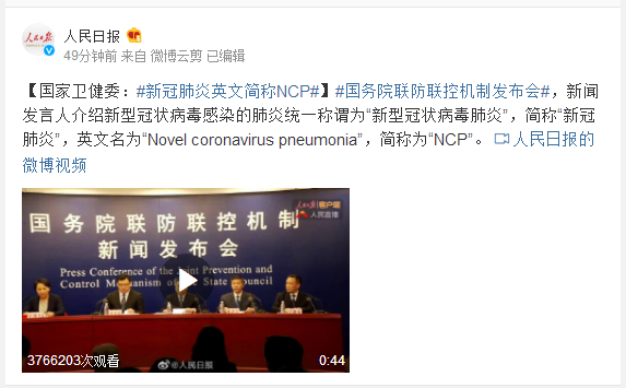 #国务院联防联控机制发布会#,新闻发言人介绍新型冠状病毒感染的肺炎统一称谓为“新型冠状病毒肺炎”,简称“新冠肺炎”,英文名为“Novel coronavirus pneumonia”,简称为“NCP”。