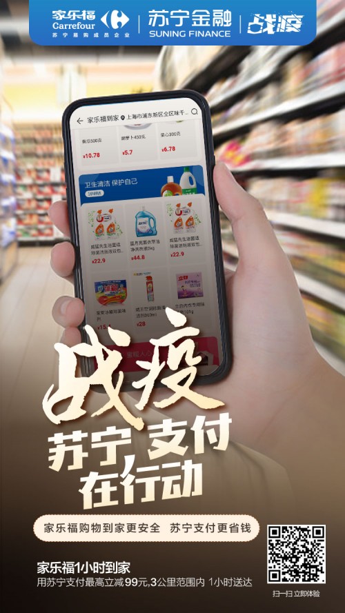 众志成城抗疫情,同舟共济保民生。这是一场没有硝烟的战争,苏宁支付联合苏宁易购、家乐福愿与你并肩前行,同心抗“疫”。上苏宁易购APP下单,家乐福门店发货,海量好物准时抢鲜到家,满足你足不出户的“宅”家愿望,记得用苏宁支付付款,省时更省钱!