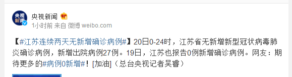 20日0-24时,江苏省无新增新型冠状病毒肺炎确诊病例,新增出院病例27例。19日,江苏也报告0例新增确诊病例。网友:期待更多的#病例0新增#
