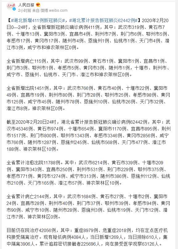 截至2020年2月20日24时,湖北省累计报告新冠肺炎确诊病例62442例,其中:武汉市45346例、黄石市974例、十堰市654例、襄阳市1170例、宜昌市895例、荆州市1517例、荆门市800例、鄂州市1343例、孝感市3346例、黄冈市2856例、咸宁市766例、随州市1287例、恩施州245例、仙桃市568例、天门市477例、潜江市188例、神农架林区10例。