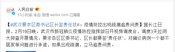 据长江日报,2月19日晚,武汉市新冠肺炎疫情防控指挥部召开视频调度会,调度3天拉网大排查开展情况,要求各区区委书记、区长都要签“责任状”,对确诊病例一个都不居家等问题进行承诺,如果出现疏漏,立马追责问责。