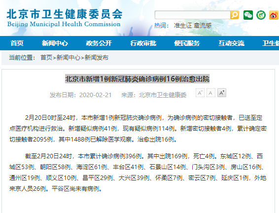 截至2月20日24时,本市累计确诊病例396例。其中出院169例,死亡4例。东城区12例、西城区53例、朝阳区58例、海淀区61例、丰台区41例、石景山区14例、门头沟区3例、房山区16例、通州区19例、顺义区10例、昌平区29例、大兴区39例、怀柔区7例、密云区7例、延庆区1例,外地来京人员26例。平谷区尚未有病例。