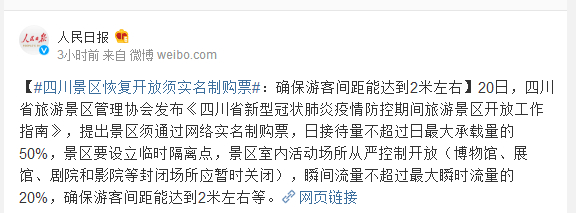 20日,四川省旅游景区管理协会发布《四川省新型冠状肺炎疫情防控期间旅游景区开放工作指南》,提出景区须通过网络实名制购票,日接待量不超过日最大承载量的50%,景区要设立临时隔离点,景区室内活动场所从严控制开放(博物馆、展馆、剧院和影院等封闭场所应暂时关闭),瞬间流量不超过最大瞬时流量的20%,确保游客间距能达到2米左右等。