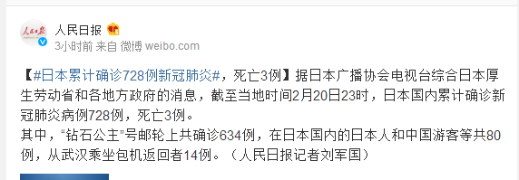 据日本广播协会电视台综合日本厚生劳动省和各地方政府的消息,截至当地时间2月20日23时,日本国内累计确诊新冠肺炎病例728例,死亡3例。