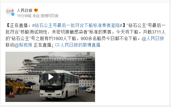 “钻石公主”号最后一批符合“核酸测试阴性、未密切接触感染者”标准的乘客,今天将下船。共载3711人的“钻石公主”号之前有约1900人下船,900余名船员今日都不会下船。