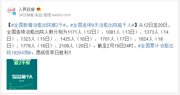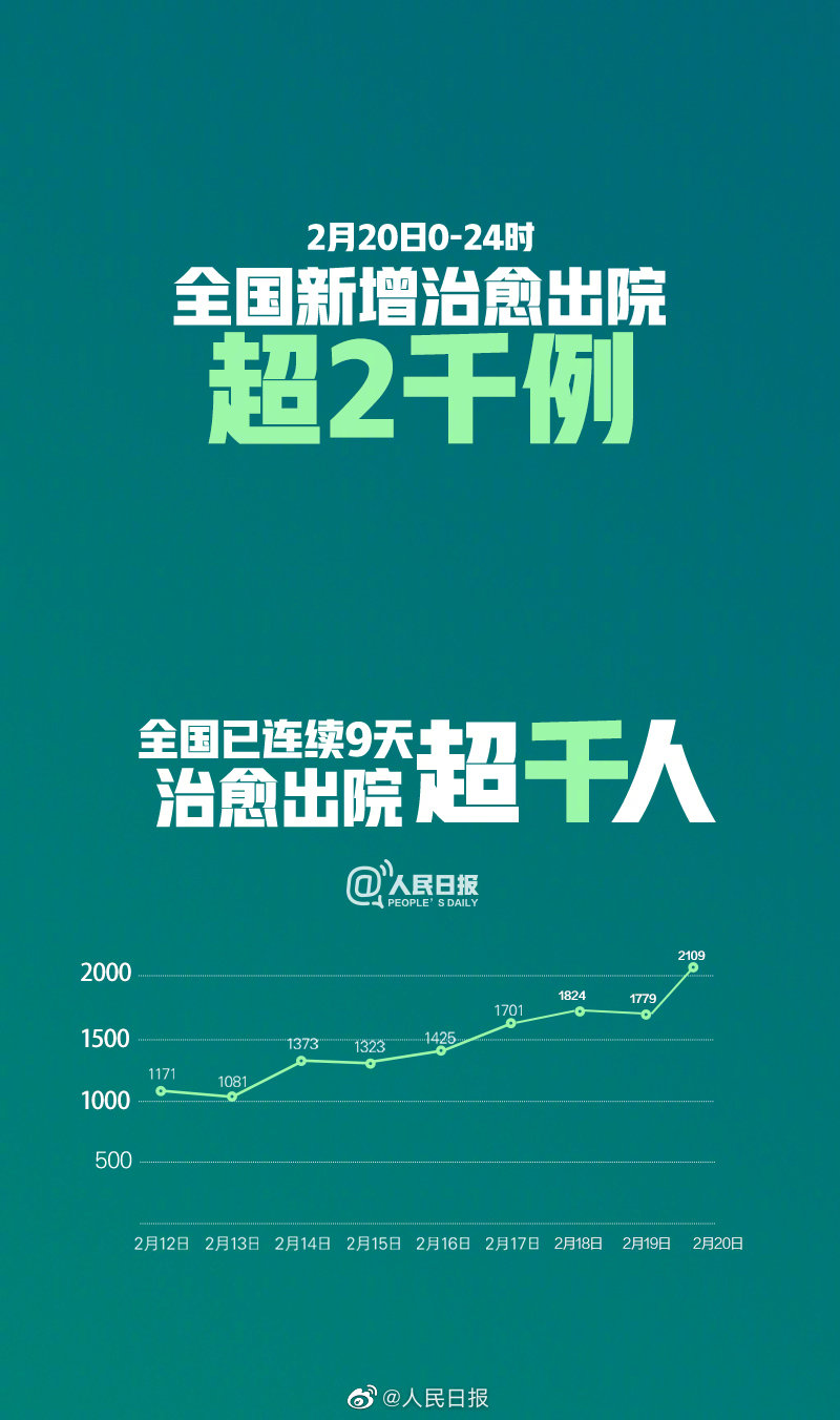 从12日至20日,全国连续治愈出院人数分别为1171人(12日)、1081人(13日)、1373人(14日)、1323人(15日)、 1425人(16日)、 1701人(17日)、1824人(18日)、1779人(19日)、2109人(20日)。截至2月19日24时,#全国累计治愈出院18264例#。愿战疫早日胜利!